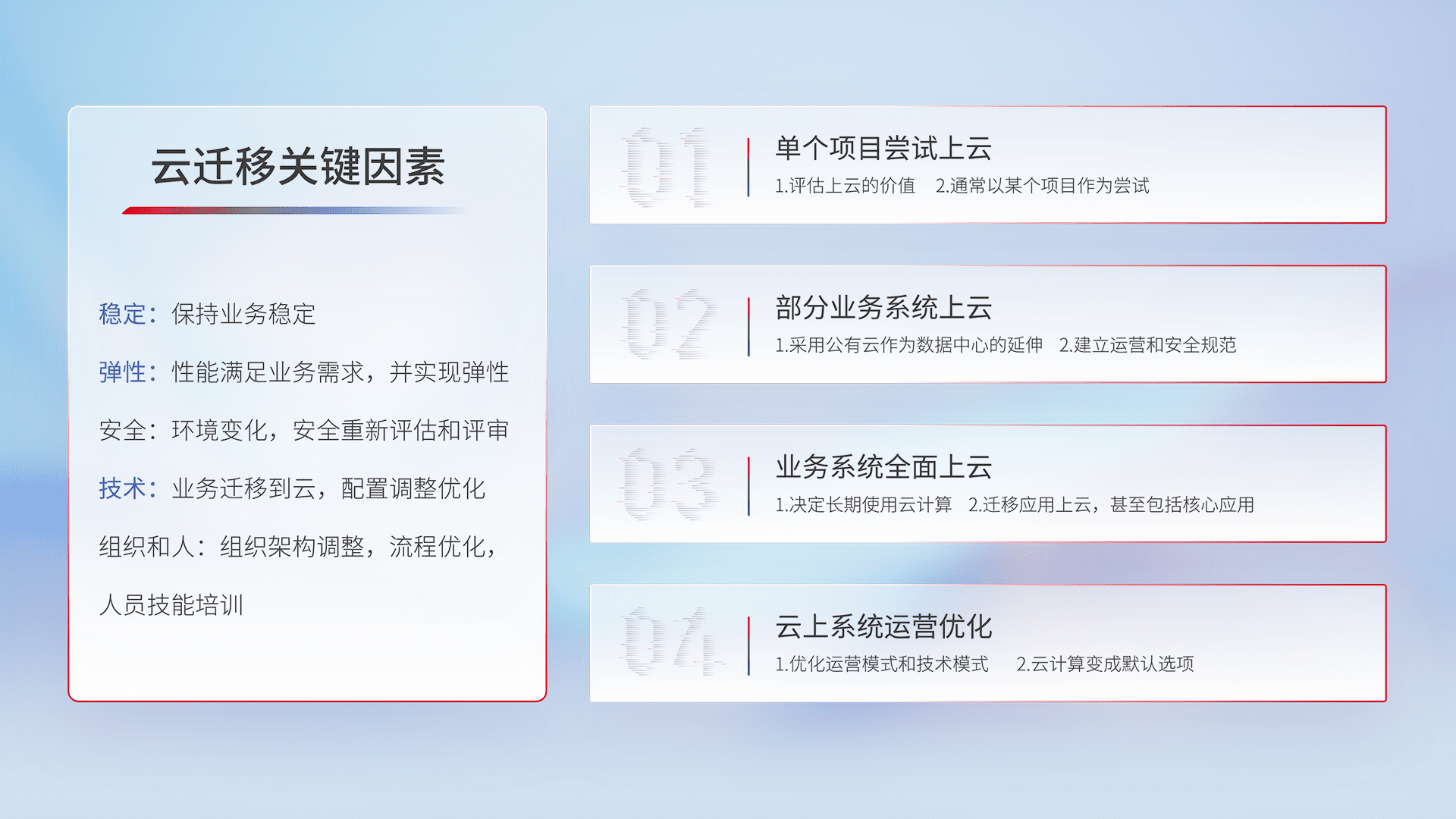结合实际业务,,,从规划设计、、、、云平台选型、、云原生改造、、、数据迁移、、、集成交付,,迁移全过程为客户识别最佳上云路径,,做好风险识别管理,,,设计网络架构、、、身份权限、、、安全审计合规、、、、操作审计、、、日志审计、、、、监控告警策略、、、、多站点容灾设计等,,,对云上基础设施进行整体规划,,提升IT治理水平,,,,以满足弹性、、、高可用、、、高性能的需求。。