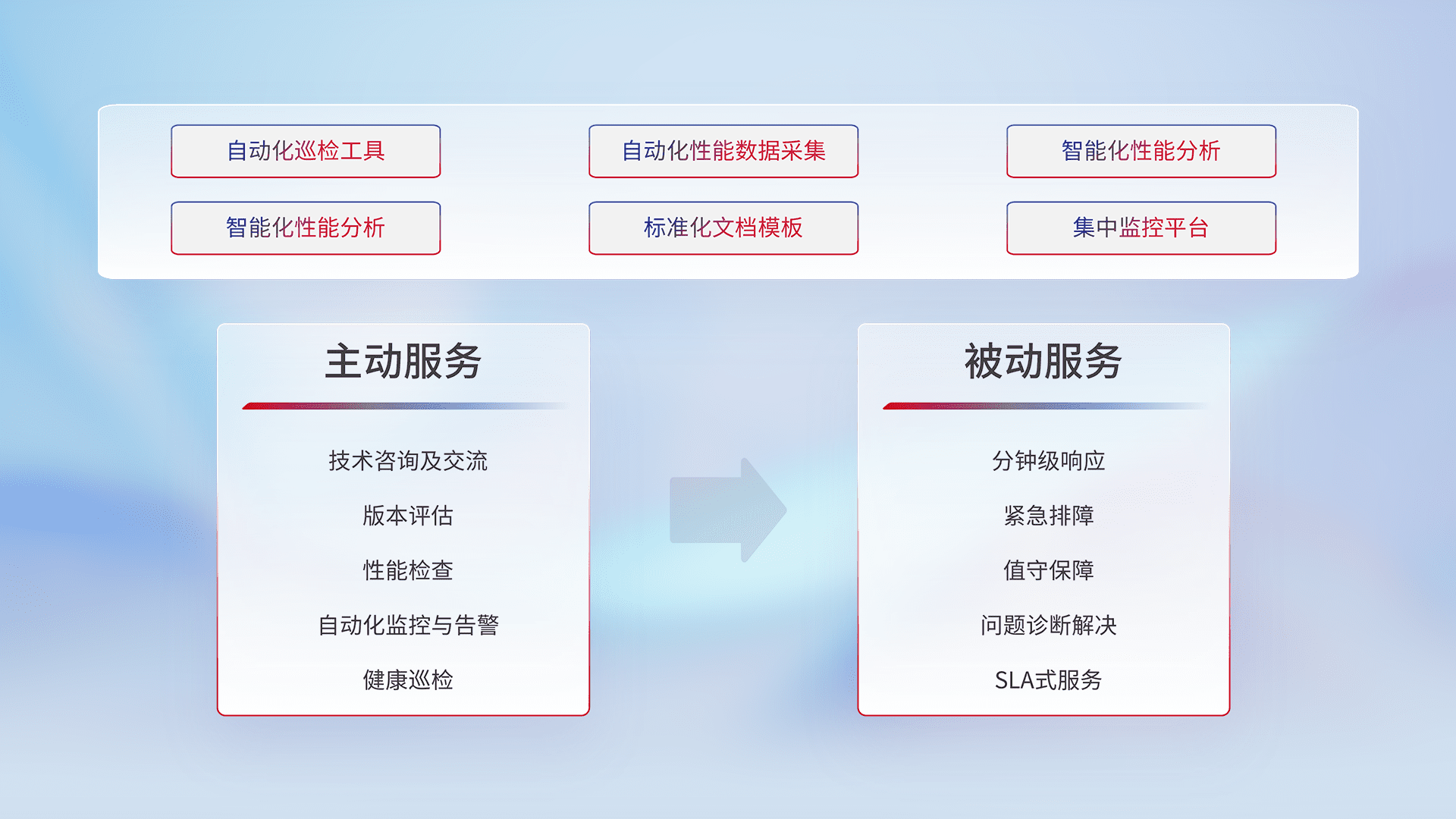 智能化工具和标准化文档,,保障服务质量,,提供主动服务(包含技术咨询、、版本评估、、、性能检查、、、自动化监控与告警、、、健康巡检)和被动服务包含(分钟级响应、、、紧急排障、、、值守保障、、、问题诊断解决、、SLA服务)。。。