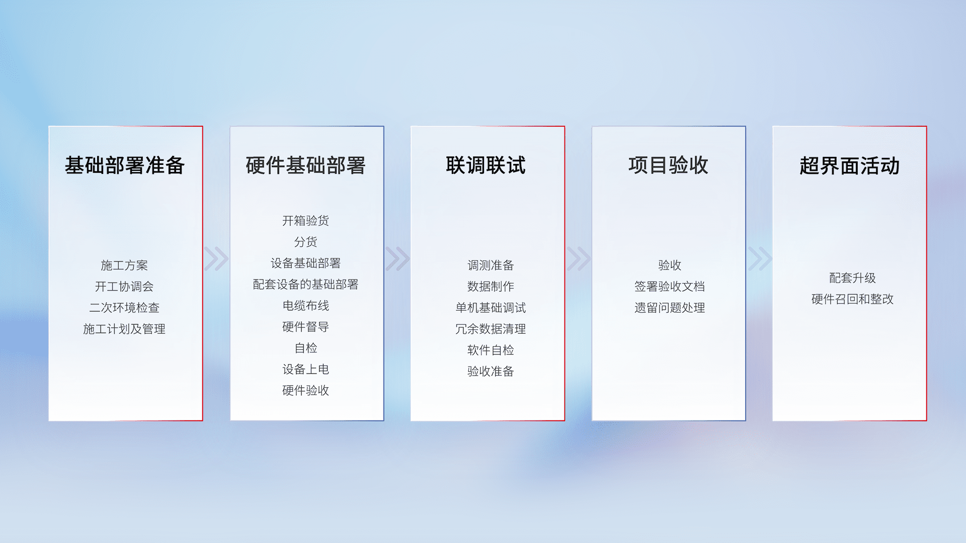 从基础部署准备、、硬件基础部署、、联调联试、、、、项目验收、、、越界面活动的全过程可追溯,,,,保证施工质量和进度。。